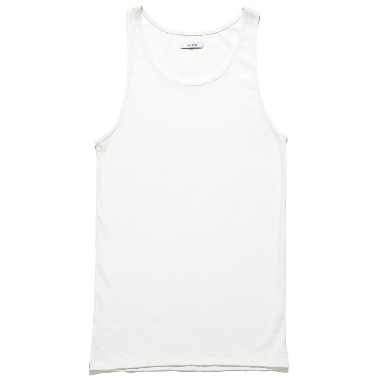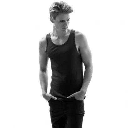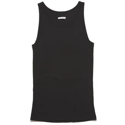 The standard of all tank tops. 1x1 rib, binding on neck and sleeve openings, flat locked side seam. 100% Cotton.