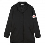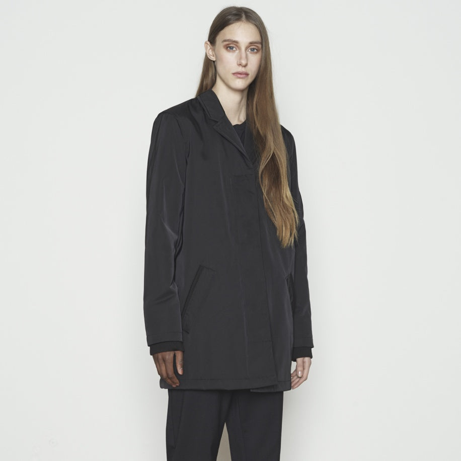 Water repellant 100% polyester coat with thin wadding. This coat has a higher neck line, with four buttons hidden placket Bottom of sleeve has an inner cuff made in a snug rib. The rib detail is also found on the pocket jet. For the AW15 season we have designed a special ’flaglabel' for the sleeve pocket inspired by classic sale signs in red text.