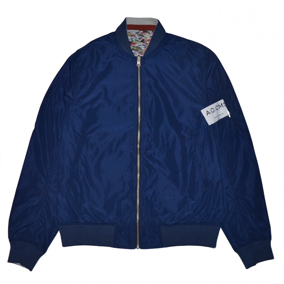 Based on our classic bomber fit we have made this version with jet pockets and a simple sleeve pocket featuring our classic A.O.CMS flag label. The jacket has also not been padded for a more spring/summer wear. As always the jacket has a reversible use, where the inside this season is a digital print made by Alma, 6 years old. Both layers are 100% Polyester.